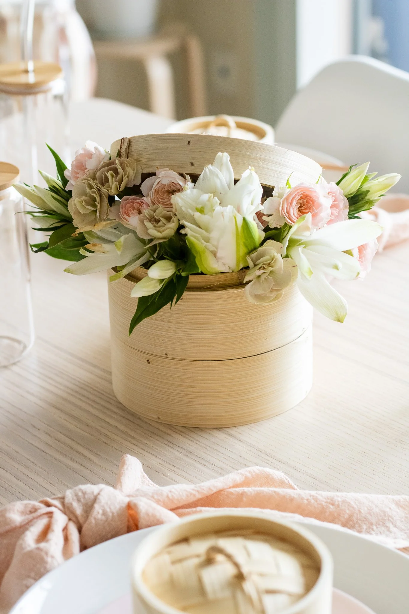 Earlier that year, I had visited Kitchen Street (Kappabashi)—a dream come true for any home baker or chef. While wandering through the shop-lined street, I picked up a few dumpling steamer baskets, already dreaming of how they’d anchor the design for her first birthday.