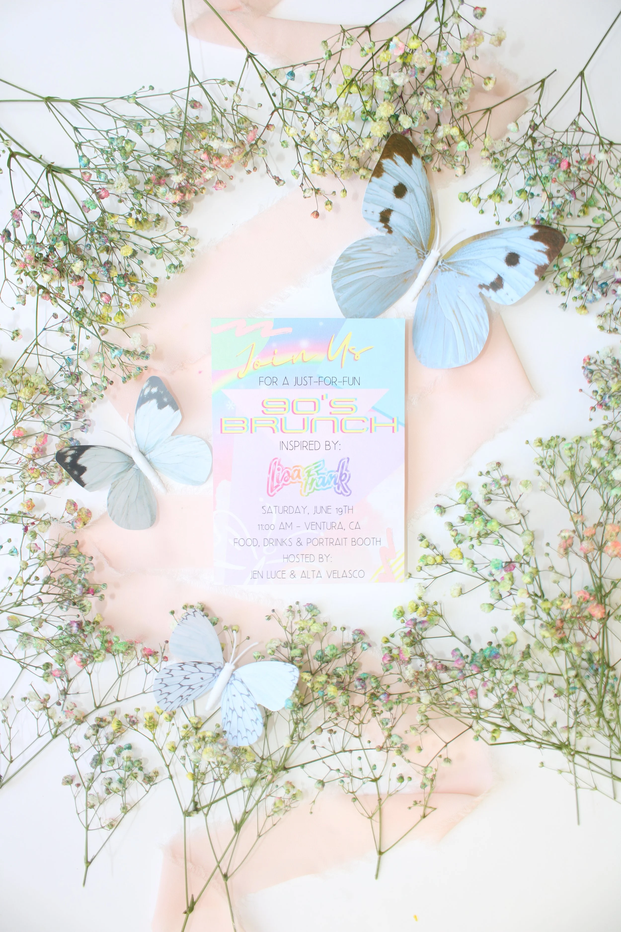 The afternoon was straight out of a rainbow-colored dream. Our vision came to life with hand-painted flowers, butterfly motifs, and color everywhere you turned. From floppy disk-tagged goodie bags packed with 90’s treasures (yes, there were slap bracelets involved) to faux-CD “place cards” , every detail made us feel like we were reliving our childhood—but with champagne.